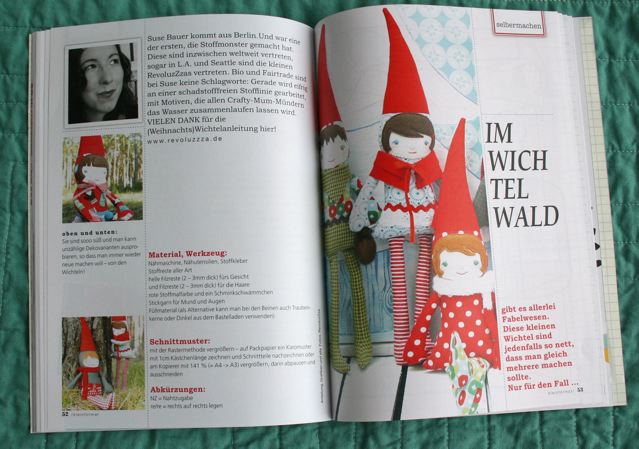 And wow, I turned the page and discovered I'm included in the mag alongside the likes of talented softie designer Suze Bauer of Revoluzzza, who also contributed a free pattern and tutorial for her adorable elves. Which makes me long to be even passably fluent in German, which I am so very not. Unilingual, me. A gap in my education, to be sure.