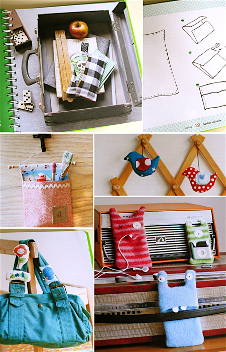 From top to bottom left to right: pencil pouch by Laura Lynn Wilson, pencil pouch diagram by Rob Shugg, hanging art pouch by Shannon Dréval, lavender birds by Joanna Stott, softie badges by Lisa Tilse, iPod creature cozies by Holly Keller.