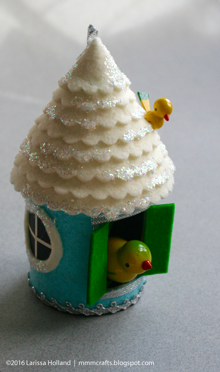 There is a toilet paper roll underneath that wool felt. And there is a cone of paper underneath the wool felt scalloped roof. I added round windows and ribbon and silver gimp trim and glitter. You must have glitter. Finished with a ribbon loop at the top so I could hang it with a wire hook.
