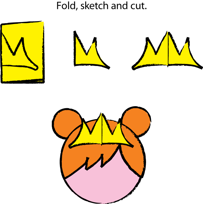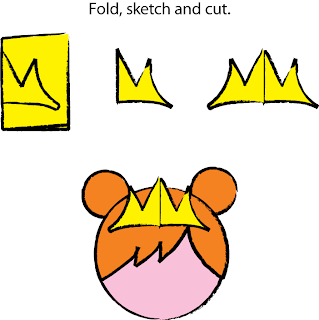 7) Fold a small piece of yellow card stock in half. Trace a half of a simple tiara shape and cut it out. Add glue to the outside edges of the tiara only so that it has some dimension when you place it on the hair.