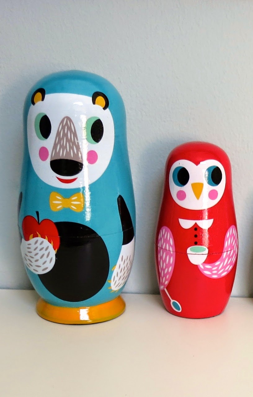 watercolors. I was so lucky to be able to buy this matryoshka directly from her. I loves it. Animals who are holding tasty things to eat. Mr Bear with an apple. Mrs Owl with a bowl of um. Pistachio pudding! Obviously.